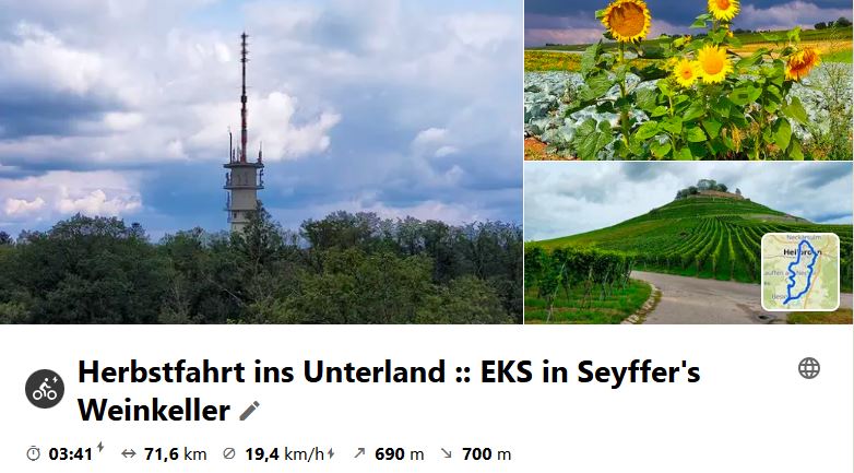 Am Morgen ging noch ein Gewitter mit starkem Regen über Besigheim nieder. Als es vorbei war, starteten die Radler zu ihrer Tour und kamen abends trocken wieder heim, trotz Wettervorschau, die mal nicht recht hatte. Schau dir die Tour auf Komoot an.