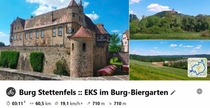 Nachdem für den Mittwoch schlechtes Wetter vorhergesagt war, wurde dienstags eine Nachmittagstour unternommen und im Burg-Biergarten von Stettenfels eine gemütliche Einkehr gemacht. Schau dir die Tour auf Komoot an.