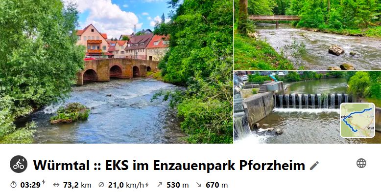 Fahrt nach Bietigheim und mit der S-Bahn nach Malmsheim. Von da dann radeln ins Würmtal bei Weil der Stadt und runter bis zur Mündung in Pforzheim. Mittagsrast im Biergarten des Enzauenparks und dann Weiterfahrt entlang der Enz bis Mühlacker. Schau dir die Tour auf Komoot an.