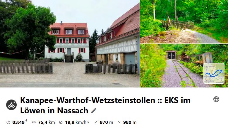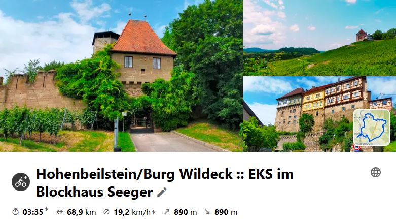 Tour an einem warmen Sommertag. Highlights an der Strecke: Hohenbeilstein, St. Annasee, Burg Wildeck, EKS im Blockhaus mit gutem Essen, Eselsberg über Flein. Schau dir die Tour auf Komoot an.