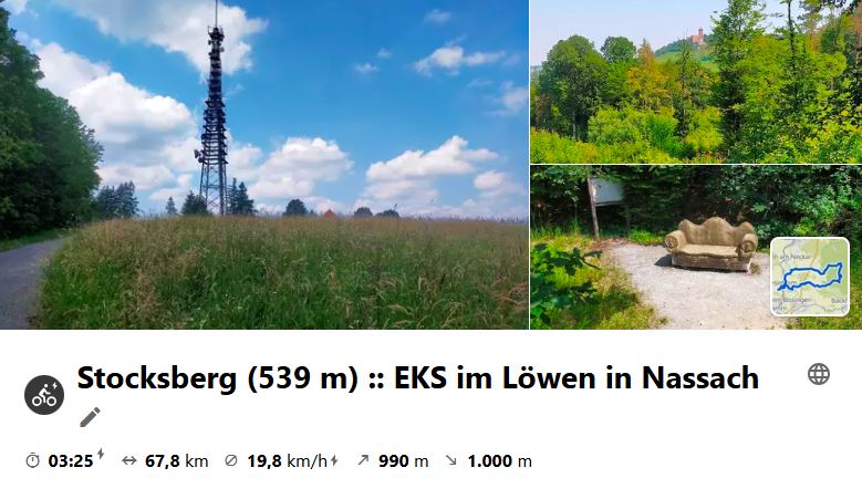 Eine schöne Tour in den Schwäbisch-Fränkischen Wald mit der weit sichtbaren Landmarke "Stocksbergsender". Start an einem wolkenlosen Morgen und Tourende gerade noch rechtzeitig vor dem Gewitter. Schau dir die Tour auf Komoot an.