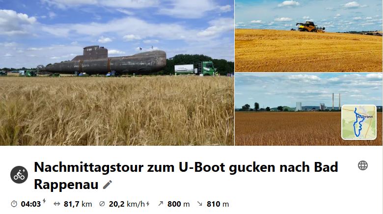 Die Tour wird schon seit Jahren von der Gruppe gefahren. Da das U-Boot gerade da war, wurde dieser Termin gewählt. Es war schon ein interessantes Bild, das sich da den Radlern bot. Auch der EKS im "Treidelpfad" war wieder Programmpunkt. Schau dir die Tour auf Komoot an.