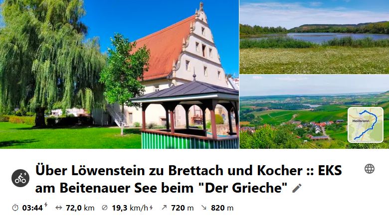 Fahrt über Löwenstein und Breitenauer See nach Bad Friedrichshall. Rückfahrt mit der Bahn ab Bad Friedrichshall mit HNV-Gruppenticket bis Kirchheim. Dann Ausrollen über Gemmrigheim mit Abschlusseinkehr im Titanic-Biergarten. Geasamtstrecke: 80 km. Schau dir die Tour auf Komoot an.
