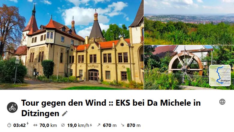 Die Radler starteten bei Nieselregen, der jedoch in Sersheim aufhörte. Nach der Besichtigung der Kirchenburg in Lienzingen und der Chartaque am Sauberg ging es nach Lomersheim in die Vereinsgaststätte von Phönix Lomersheim zum Mittagessen. Als es dann zur Heimfahrt ging, setzte recht starker Regen ein, der die Radler in ihre Regenkleidung drängte. Nach einer Stunde Fahrt wurde der Regen dann weniger und hörte fast ganz auf, als man durch die Langmantelhöfe fuhr. Schau dir die Tour auf Komoot an.