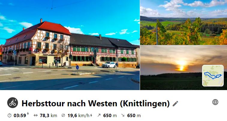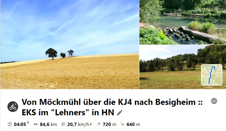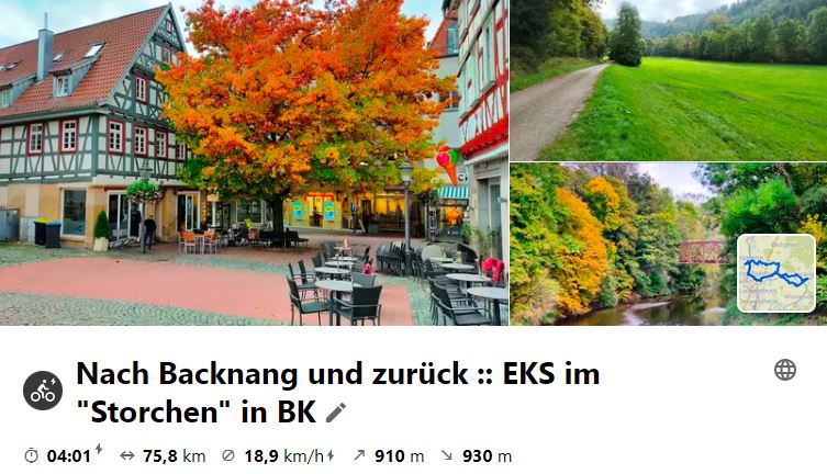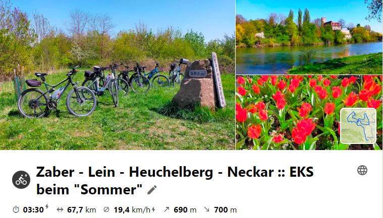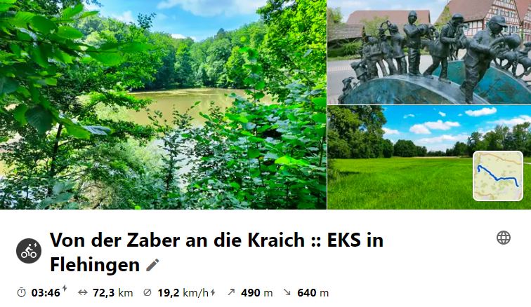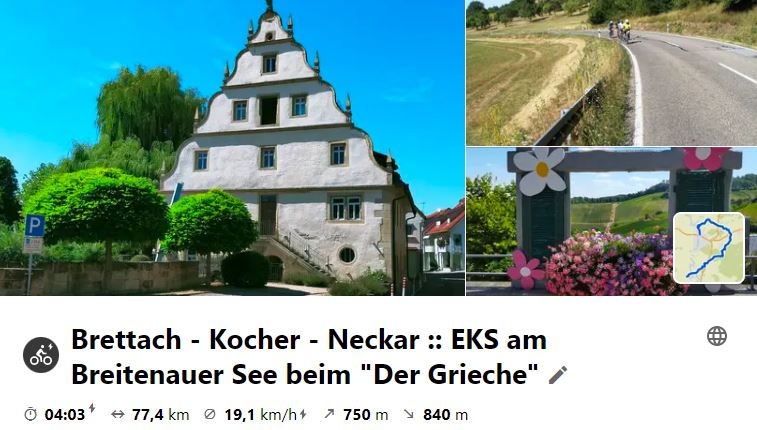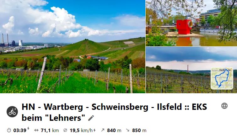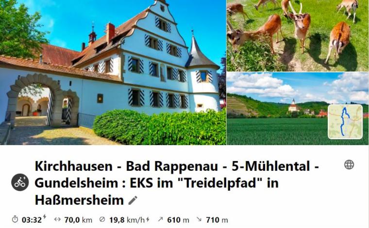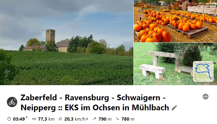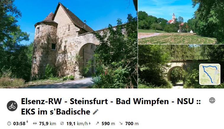 Nachdem die letzte MiRaTour wegen großer Hitze ausfallen musste, fand nun die schon lange geplante Tour nach Steinsfurt als Ersatz an einem Montag statt, da das Mittagslokal eh am Mittwoch Ruhetag hätte. Über den Heuchelberg ging es vor Richen auf den Elsenz-RW, der nach Steinsfurt führte, wo Mittagspause war. Bei der Rücktour wurde an der Burg in Grombach und am Schloss in Babstadt vorbei geschaut, bevor es an Bad Rappenau vorbei nach Bad Wimpfen ging. Hier gönnte man sich eine kleine Besichtigung, bevor nach NSU geradelt wurde, um mit dem RegioExpress nach Bietigheim zu fahren und gemütlich heimzuradeln.