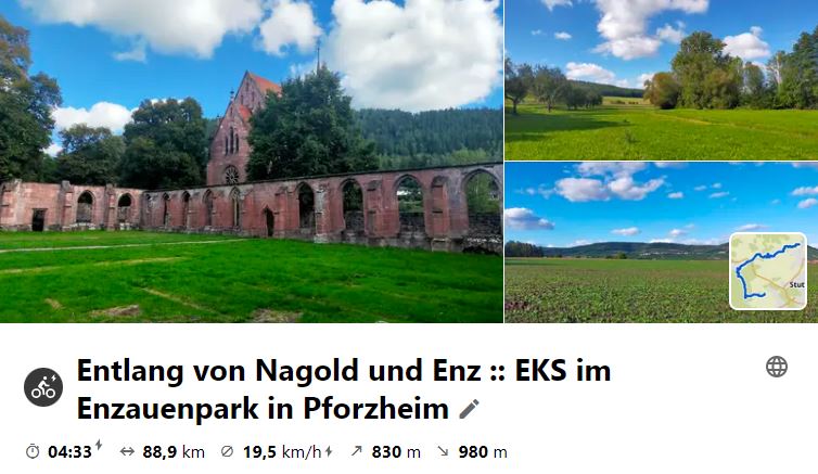 Tourstart in Besigheim bei 6,5 Grad. Radeln nach Bietigheim und mit der S-Bahn nach Weil der Stadt. Von hier über den Simmozheimer Berg nach Hirsau, wo das ehem. Kloster angeschaut wurde. Dann durch Nagoldtal nach Prorzheim zur Mittagsrast. Heim ging es dann über den Enztalradweg bis Vaihingen und dann über Sersheim in den Weißenhof zur Abschlusseinkehr im Hofcafé Scheuler. Gesamtradelstrecke 97 km.