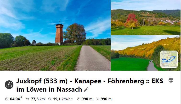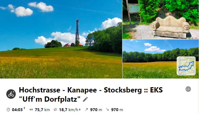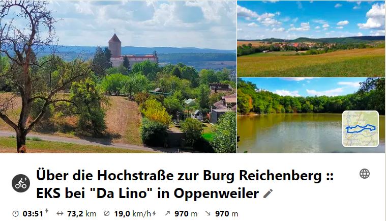 Nach dem 9-Euro-Ticket war erstmals bei der Mittwochstour wieder keine Bahnfahrt dabei. Es ging über Großbottwar auf die Hochstraße durch den Schwäbisch-Fränkischen Wald zur Burg Reichenberg, die man auf allen früheren Touren in diese Gegend links liegen ließ. Unterwegs wurde in Völkleshofen am Historischen Brunnen, am Steinernen Kanapee, am Prinzenstein und der Buch-Eiche gestoppt. Bei der Burg angekommen konnten wir dank eines dort gerade tätigen Handwerkers in den Innenhof und uns umschauen, denn das Tor ist üblicherweise geschlossen. Dann ging es nach Oppenweiler hinunter wo in einem kleinen italienischen Lokal ein vorzügliches Mittagessen war. Heim ging es über die übliche Strecke über Rietenau und Kleinaspach. Im P35 war dann noch ein netter Tourabschluss. Schau dir die Route und Bildbericht bei Kommot an: https://www.komoot.de/tour/918749875?ref=wtd