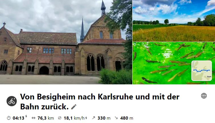 Nach 2019 ging es erstmals wieder nach Karlsruhe. An den Böllstrichseen wurde Mittag gemacht und eine Forelle verspeist. In Karlsruhe angekommen wurden die Radler auf der Durlacher Allee mit Regen empfangen, so dass man sich gleich ins Vogelbräu rettete. Wegen dem Regen fand dann die geplante Stadtrundfahrt (Residenz, Orangerie, BGH, usw.) nicht statt und man fuhr direkt auf den Bahnhof. In Bietigheim angekommen regnete es schon wieder, so dass man Regenkleidung anlegte und nach Besigheim radelte.