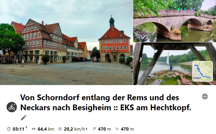 Die Radler trafen sich in Bietigheim am Bahnhof und fuhren mit der S-Bahn nach Schorndorf. Dann ging es der Rems entlang über Waiblingen nach Neckarrems, wo im Hechtkopf Mittagspause war. Weiter ging es den Neckar abwärts nach Hessigheim ins "Gässle", wo noch zum Tourabschluss gestoppt wurde. Bis dahin fuhr man durchweg durch Nieselregen. Erst die paar km nach Besigheim waren dann ohne Regen! Trotzdem war es wieder eine schöne Route.