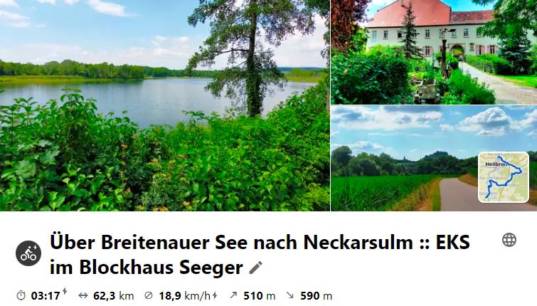 Die Tour ging über Lauffen ins Schozachtal und zum EKS ins Blockhaus Seeger. Nach gemütlicher Mittagsrast ging es über den Berg zum Breitenauer See, der derzeit wieder gefüllt wird. Jedoch fehlen noch einige Meter bis zur vorherigen Wasserhöhe. Auf dem Weg ins Sulmtal wurde in Weiler das Schloss angeschaut (nur von außen, da privat!). In NSU angekommen wurde die Zeit bis zur Zugabfahrt mit einer Abschlusseinkehr unter schattigen Plantanen auf dem Marktplatz überbrückt. In Walheim stiegen dann alle aus (ebenerdig!) und rollten dann vollends heim.