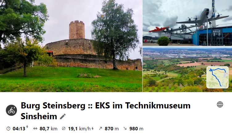 MiRaTour wegen schlechtem Wetter auf Donnerstag verschoben. Tourstart in Besigheim bei 8 Grad. Über Brackenheim und den Heuchelberg ging es zunächst nach Stetten. Von da nach Steppach, unterwegs Besuch des Schosses Schomberg, ins Elsenztal bis Reihen. Hier ging es hinauf nach Weiler und dann auf die Burg Steinsberg. Hier sollte die Mittagspause stattfinden, jedoch hatte das Lokal kurzfristig geschlossen. Nach Besteigung des Bergfriedes ging es nach Sinsheim ins Restaurant des Technikmuseums um sich dort zu stärken. Heim ging es dann wieder über Reihen, Grombach, Babstadt. Bad Rappennau und Bad Wimpfen nach Neckarsulm und mit dem Zug (HNV-Gruppenticket) nach Kirchheim. Dann nochmals 9 km "Ausrollen". Gesamtradelstrecke 89 km.