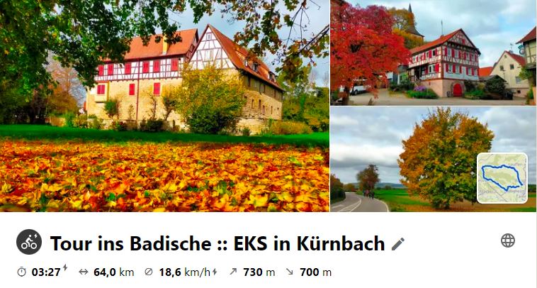 Bei Nebel starteten die Tourteilnehmer nach Brackenheim. Hier wurde nach Besichtigung des "Mittelpunkt des Zabergäus" auf die Heuchelberghöhe gefahren und über Ochsenburg nach Kürnbach, wo Mittagspause war. Der Rückweg führte über Diefenbach und die Strombergwälder beim Füllmenbacher Hof in den Löchgauer Weißenhof, wo noch eine gemütliche Abschlusseinkehr zur Ende der Radelsaison gemacht wurde.