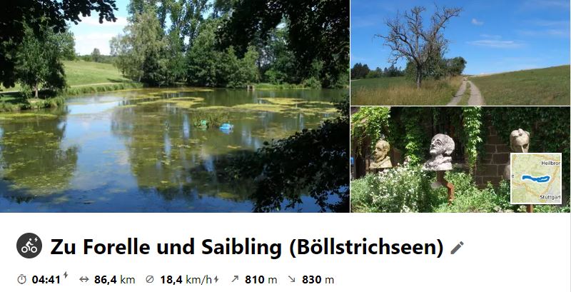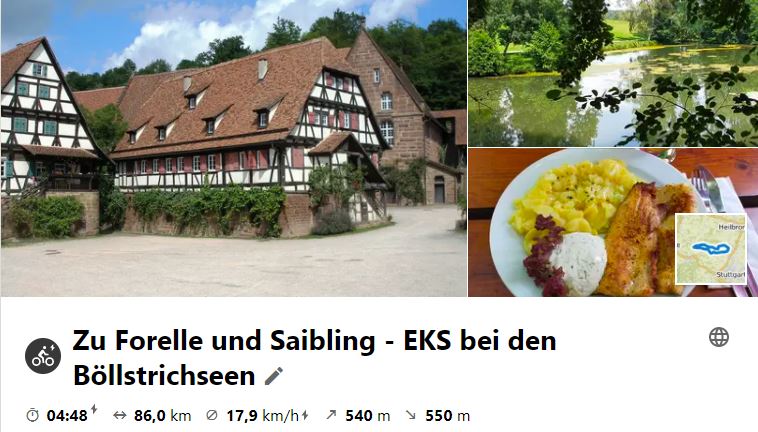 Am 1. Juli 2020 führte die Tour neun Radler zu dem Böllstichseen bei Bauschlott. Gestärkt hat man sich dort mit Forelle und Saibling. Auf der Rücktour wurde ersmals im Schafhof in Maulbronn gestoppt und sich umgesehen. Von da ging es dann steil aufwärts zum Roßweiher. Über Ensingen, Kleinglattbach und Sachsenheim fuhr man ins Enztal und nach Besigheim.
