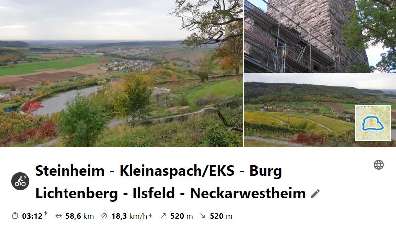 Am 21. Oktober 2020 ging die Tour der Pedelcfahrer bei herbstlichem Wetter über Pleidelsheim, Steinheim und Rielingshausen nach Kleinaspach, wo im Sonnenhof der EKS war, bei dem die Teilnehmer bestens bewirtet wurden. Gestärkt wurde dann über Sinzenburg und Neuweirtshaus hoch zum Tourhighlight Burg Lichtenberg gefahren und der Ausblick genossen. Weiter ging es durchs Bottwartal nach Ilsfeld und über den Leuchtmannshof und Neckarwestheim nach Hause.