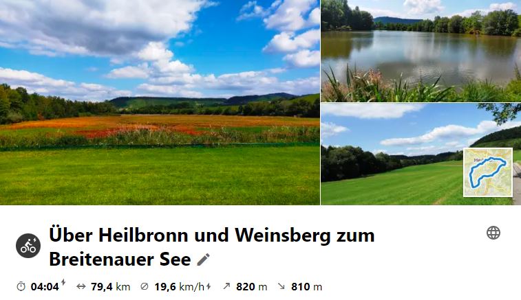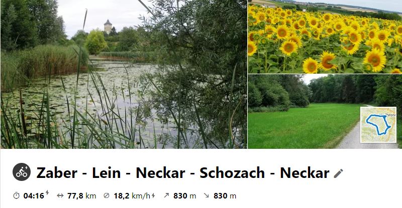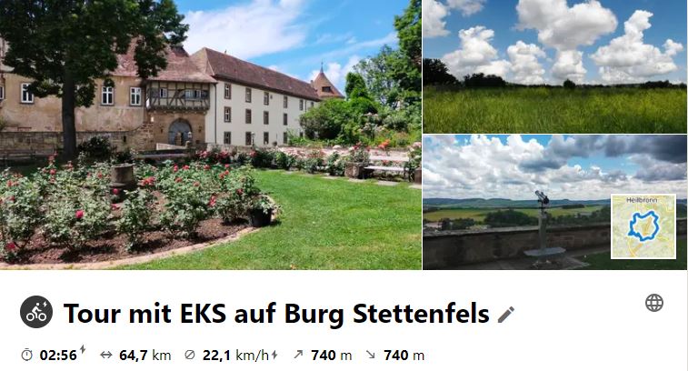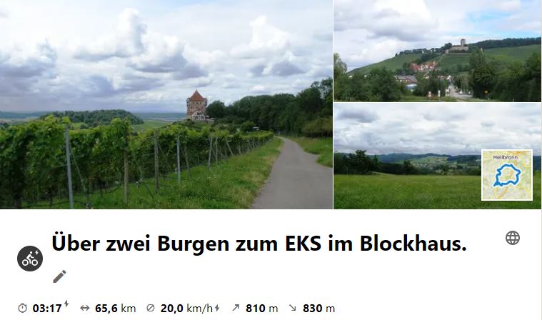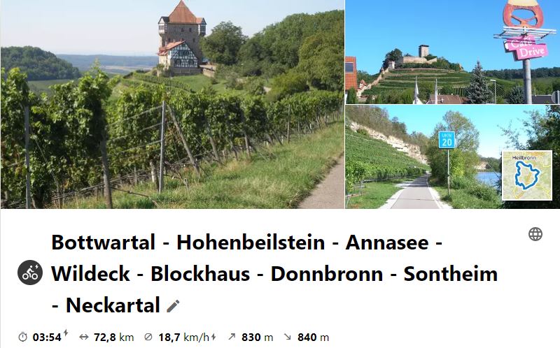 Am 4. Aug. 2021 ging die Tour durchs Bottwartal auf den Langhans. Weiter zum St. Anna - See und zur Burg Wildecke und weiter zum EKS im Blockhaus. Rückweg über Donnbronn, Flain, Haigern, Talheim, Lauffen.