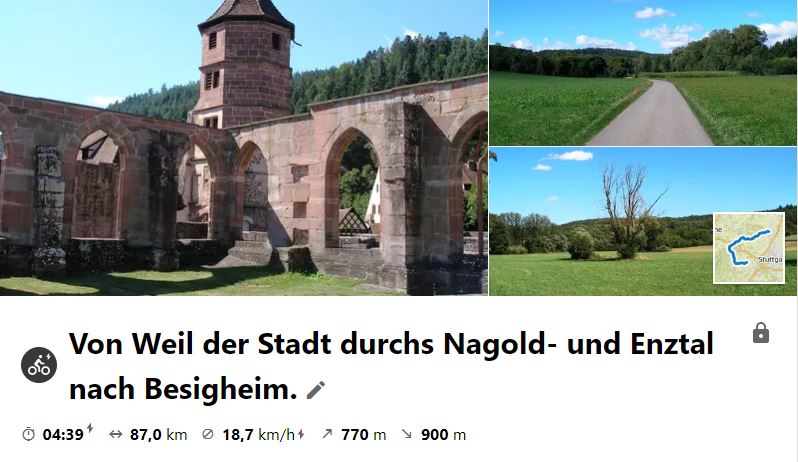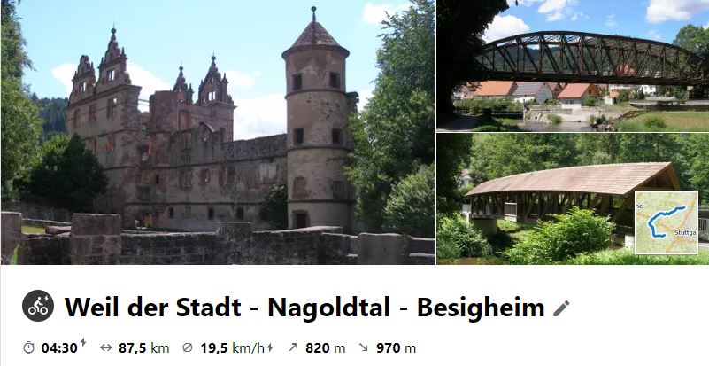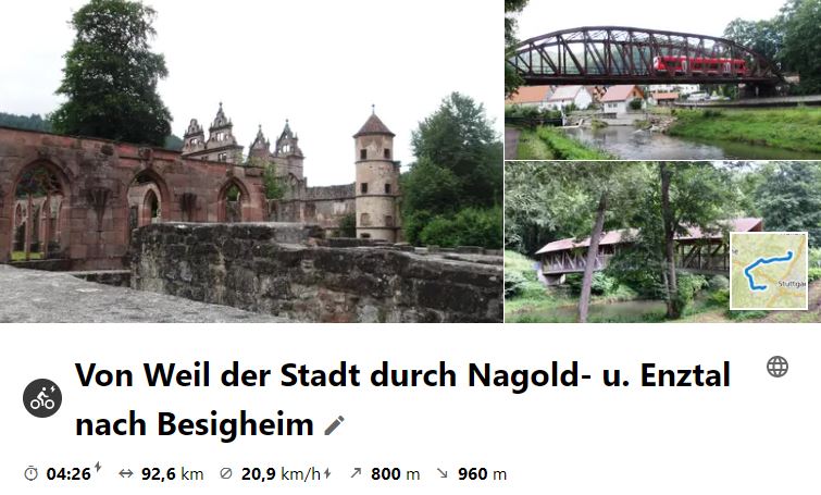 Am 3. Juli 2020 unternahmen einige Radler (die auch freitags Zeit hatten) eine "Erkundungs"-Tour durchs Nagoldtal, um sie eventuell mit großer Gruppe nachzuradeln. Start war in Weil der Stadt. Die Tour ist mit Anfahrt zum Bhf in Bietigheim ca. 98 km und hat in Simmonzheim einen langen Anstieg auf die Hochfläche.