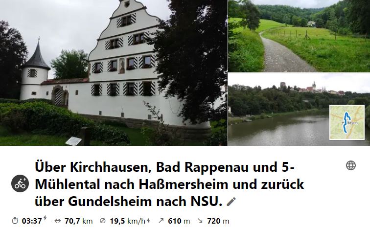 Jährlich ging eine Fahrt entlang des Neckars mit der Gruppe nach Eberbach. Nachdem man jedoch bei der Rückfahrt mit der Bahn inzwischen 2x umsteigen muss, wurde am 28. August 2021 eine neue Tour nach Haßmersheim, wo wir immer mittagessen, gewählt. Dann wurde bis Neckarsulm zurück gefahren und der Rest mit der Bahn (ohne Umsteigen) bis Kirchheim/N (HNV-Gruppen-Tarif). Zum Abschluss dann nochmals 8 km nach Besigheim ausrollen.