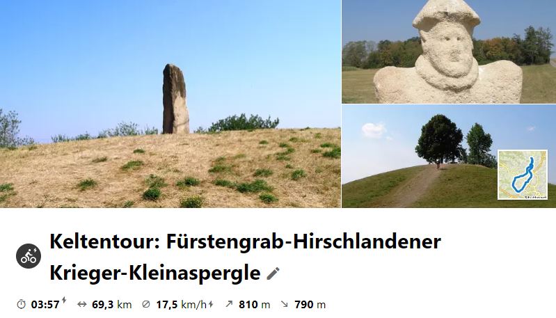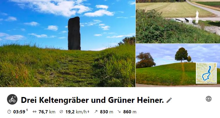 Wegen schlechtem Wetter am Mittwoch wurde die Tour auf Donnerstag, den 14. Oktober 2021 verlegt. Beim Start hatte es gerade mal 6 Grad, jedoch wurde es tagsüber immer besser. Die Fahrt ging zunächst zum Keltenfürstgrab in Hochdorf und dann zum Hirschlandener Krieger. In Höfingen schwenkte man ins Glemstal zum Mittagessen bei Da Michele. Weiter ging es auf den Grünen Heiner und dann zum Kleinaspergle.
