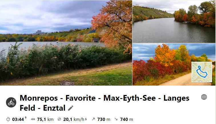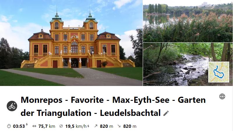 Am 16. September 2020 ging die Tour, wie jedes Jahr einmal, zum Max-Eyth-See. Um nicht den Neckartalradweg ab Besigheim zu fahren, der bei vielen anderen Touren auch genutzt wird, ging es über den Monrepos und das Schloss Favorite erst in Ludwigsburg an den Neckar. Die Rücktour ging durchs untere Feuerbacher Tal hinauf nach Zazenhausen, durch Kornwestheim und Stammheim zum Garten der Triangulation an der Solitudeallee. Weiter und erstmals bei einer Tour besucht, wurde die Wüstung Vöhingen. An Markgröningen vorbei ging es ins Leudelsbachtal und dann an der Enz entlang zum P35 zum Tourabschluss, bevor es dann vollends nach Hause ging.