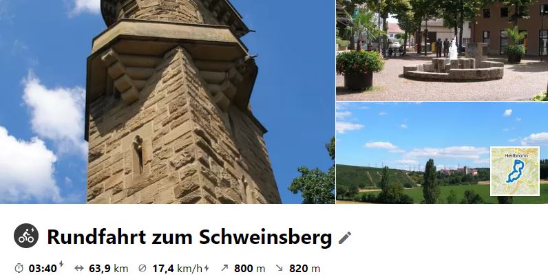 Am 5. August 2020 war das Ziel der Schweinsberg mit seinem Aussichtsturm und dem Fernmeldeturm. Die Hintour führte über die Felsengärten, die römischen Ausgrabungen in Ottmsheim, Ilsfeld, Wüstenhausen, Untergruppenbach und Donnbronn. Zur Mittagsrast wurde dann nach Flein hinunter gefahren. Die Rücktour führte zuerst an den Fleiner Leberbrunnen, um den sich schon seit 400 Jahren schon Geschichten ranken. Über den Haigern ging es dann ins Schozachtal, das zum Leuchtmannshof wieder verlassen wurde. Über NWH und Gemmrigheim ging es dann noch zum Tourabschluss in den Beirgarten beim Freibad.
