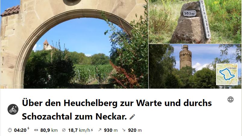 Am 19. August 2020 ging die Tour am Schloss Stocksberg vorbei zum höchsten Gipfel des Heuchelbergs mit 353 m. Dieser ist eine Erdaufschüttung über der ehemaligen Raketenabschussbasis "Heuchelberg". Dann ging es über den Zweifelsberg zur Heuchelberger Warte, wo Mittagsrast war. Die Heimtour ging hinab nach Klingenberg und in Horkheim ins Schozachtal. Über Abstätter Hof und Wunnensteinsattel wurde dann nach Ottmarsheim geradelt und über Hessigheim nach Besigheim. Im Freibadbiergarten gönnten sich dann die Radler nach einer flotten Tagestour noch einen Einkehrschwung.